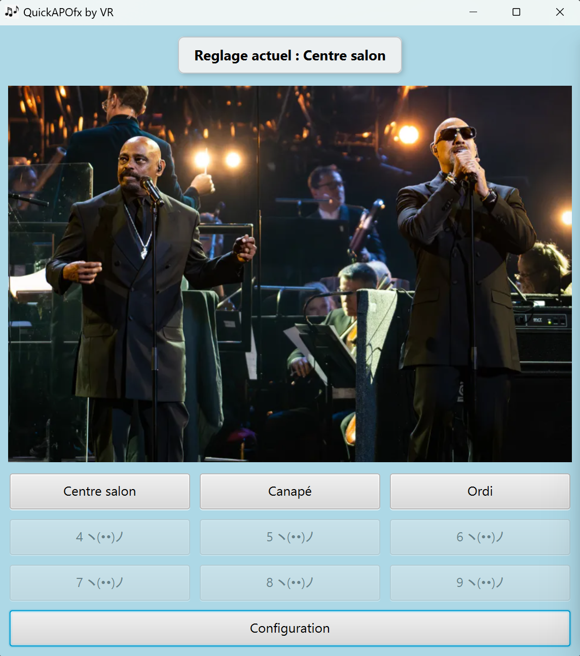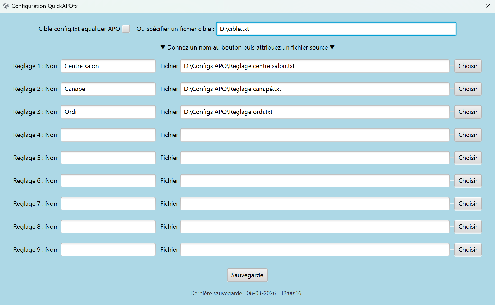 Mode d’emploi pour APO equalizer : Faites votre premier réglage dans APO equalizer (exemple typique : pour écoute dans le salon) puis sauvegardez. Copier son config.txt dans un dossier de votre choix, nommez le comme vous voulez (typiquement « Écoute salon.txt » ou « Écoute ordi.txt »). Faites votre second réglage, répétez l’opération. Lancez QuickAPOfx, cliquez sur configuration, paramétrez vos boutons et vos .txt sources (écoute canapé…), pensez à enregistrez, puis fermez la fenêtre de configuration. Vous pouvez désormais écraser le config.txt d’APO d’un simple clic.